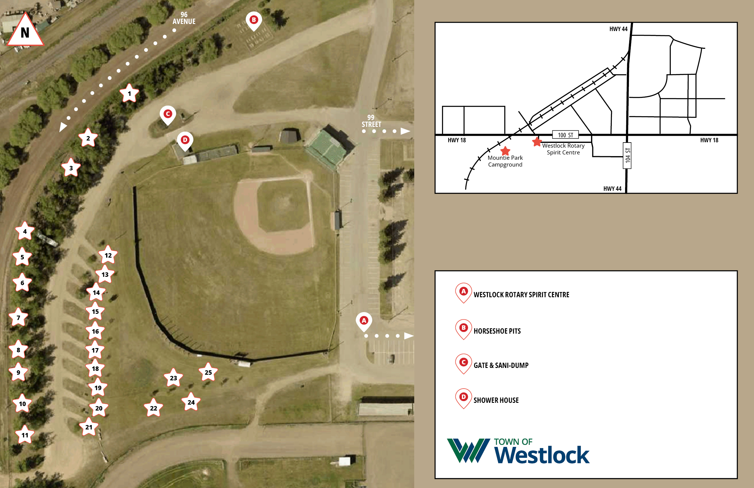 Located in Westlock at 100 Street and 96 Avenue, Mountie Park Campground is a campsite with 27 sites, most sites have power, water and sewer. Please check out the site details below. There is access to washrooms, showers, ball diamonds, horseshoe pits, a half-mile horse race track, and rodeo facilities. The fill station at the campground is non-potable water. Potable water is available for a charge at the bulk water station located at 10035 108 Street.