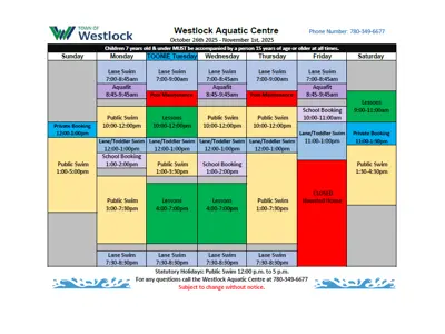 - Group swimming lessons, aqua-fit, public swim, and lane swim