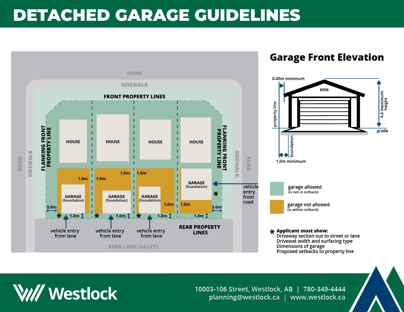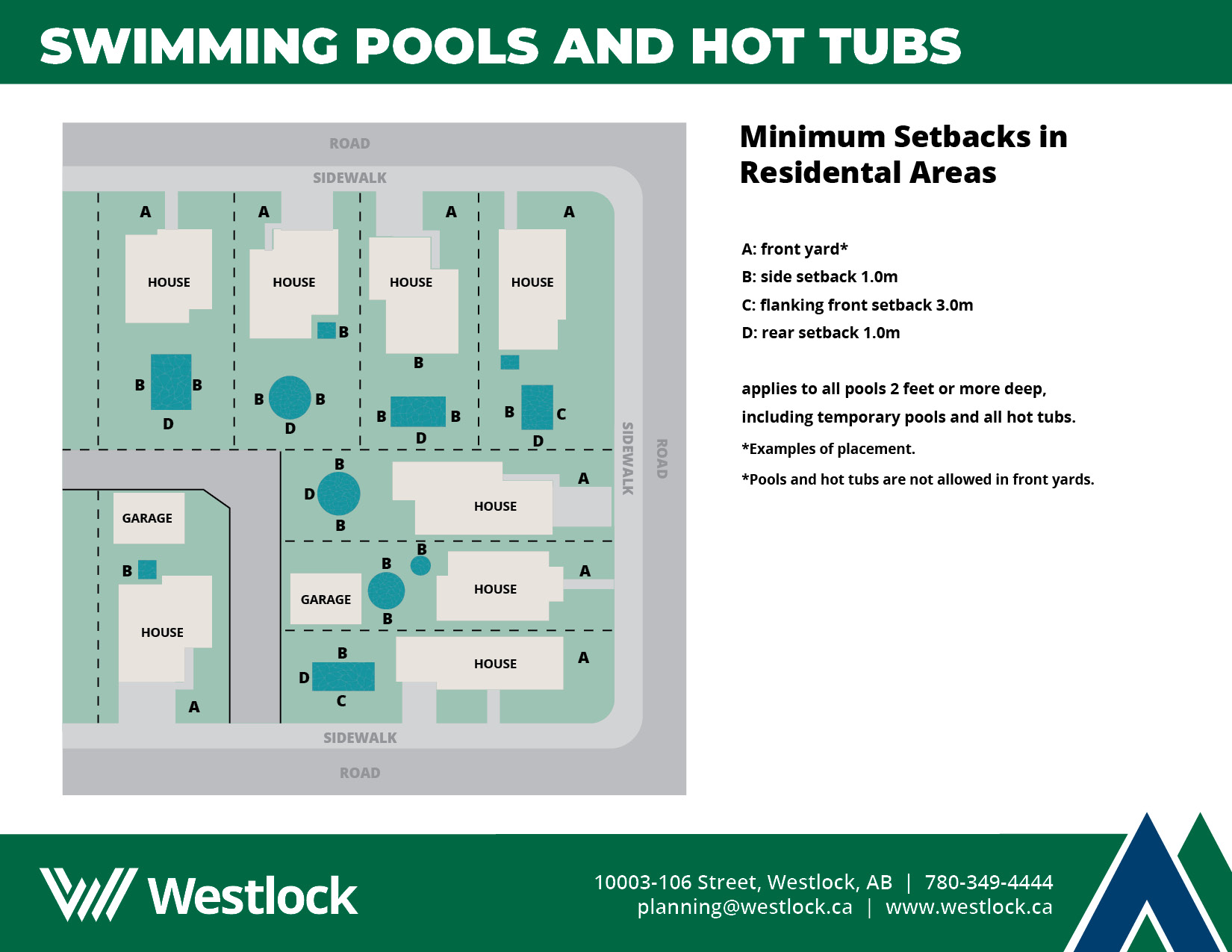 Placement Matters: Structures must meet setback distances from property lines and not encroach on easements or utility rights-of-way. Accessory buildings must be set back 1.0m from a side property line or rear property line, 6.0m from the front property line and 3.0m from a flanking front (corner side) property line. Accessory buildings must also have a separation distance of 1.5m (4.9ft) from any other accessory building or your house.