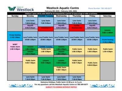 - Group swimming lessons, aqua-fit, public swim, and lane swim