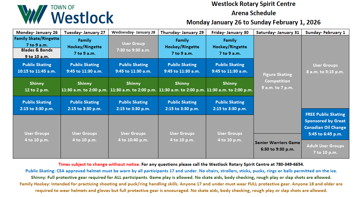 - Public Skating: CSA-approved helmets must be worn by all participants 17 and under. No chairs, strollers, sticks, pucks, rings or balls permitted on the ice.
